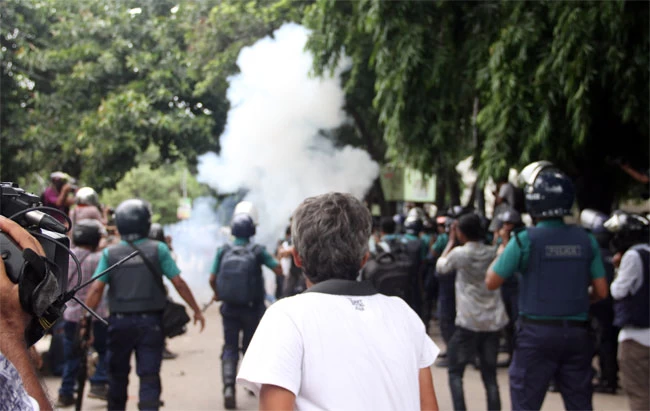 বিকেল ৩ টার পর থেকে টিএসসিতে দফায় দফায় সাউন্ড গ্রেনেড ছুড়ে আতঙ্ক ছড়িয়েছে পুলিশ। এসময় পুলিশের ছোড়া শব্দ বোমায় আহত হন বেশ কয়েকজন সংবাদকর্মী। সাউন্ড গ্রেনেডের প্রচণ্ড শব্দে ছত্রভঙ্গ হয়ে যান শিক্ষার্থীরা। এরপর তারা ভিসি চত্বর, মল চত্বরসহ ক্যাম্পাসের বিভিন্ন জায়গায় অবস্থান নেন।
