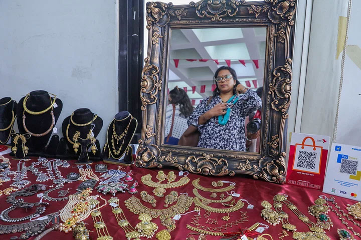গয়না গলায় পরে দেখে নিচ্ছেন এক ক্রেতা।